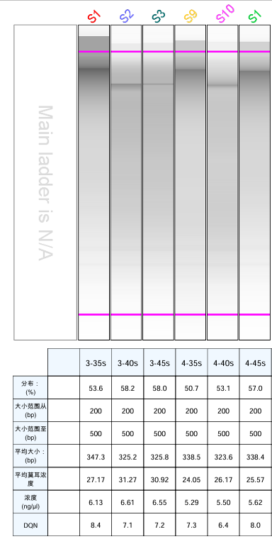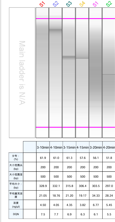 从上图可看出:10分钟的效果最佳,大部分在300-500 bp之间